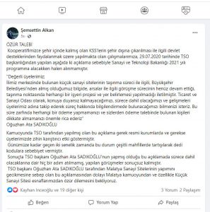Özsan Sanayi Sitesi  Yapı Kooperatifi Başkanı Şemsettin Alkan,Sosyal medya hesabından yaptığı açıklama da TSO Başkanı Oğuzhan Ata Sadıkoğılu’nun Malatya Sanayi sitesinin gecikmesinden dolayı  Özellikle Küçük Sanayi Sitesi esnaflarından özür dilemesini istedi.