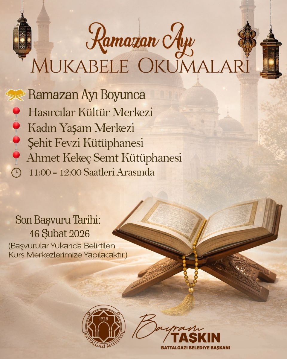 Battalgazi Belediyesi, Ramazan ayının manevi atmosferini vatandaşlarla birlikte yaşatmak amacıyla geleneksel Mukabele Okumaları programını bu yıl da hayata geçiriyor. Kültür, Sanat ve Sosyal İşler Müdürlüğü koordinesinde düzenlenecek program kapsamında başvuru süreci başladı. Mukabele, Ramazan ayı boyunca Kur’an-ı Kerim’in her gün bir bölümünün (cüz) karşılıklı olarak okunması esasına dayanan ve asırlardır sürdürülen bir ibadet geleneği olarak biliniyor. Bu gelenekle Ramazan ayı süresince Kur’an-ı Kerim baştan sona okunmuş oluyor. Ramazan ayı boyunca gerçekleştirilecek Mukabele Okumaları; Hasırcılar Kültür Merkezi, Gelinciktepe Kadın Yaşam Merkezi, Şehit Fevzi Kütüphanesi ve Ahmet Kekeç Semt Kütüphanesi’nde yapılacak. Programların her gün saat 11.00 ile 12.00 arasında gerçekleştirileceği bildirildi.
