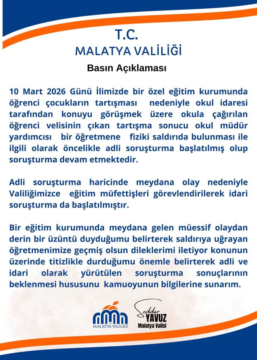 Valilikten yapılan açıklamada, 10 Mart 2026 tarihinde bir özel eğitim kurumunda öğrenciler arasında yaşanan tartışma nedeniyle okula çağrılan bir velinin çıkan tartışma sırasında okul müdür yardımcısı olan bir öğretmene fiziki saldırıda bulunduğu belirtildi.